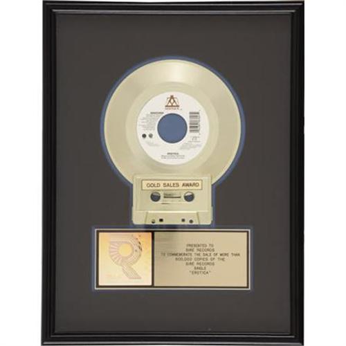<B>Madonna "Erotica" RIAA Gold Single Award.</B></I> An RIAA award presented to Sire Records to commemorate the sale of more than 500,000 copies of Madonna's chart-topping title single from her 1992 LP. Framed to an overall size of 13" x 17" and in Excellent condition.<BR><BR><b>Shipping:</b> Framed - with Glass, Medium (<a target="_blank" href="http://www.heritageauctions.com/common/shipping.php">view shipping information</a>)