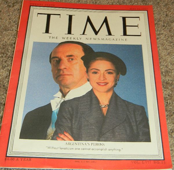 Prop Time Magazine from the film Evita showing Madonna on the cover as Eva Peron. This item comes with a certificate of authenticity good for the life of the piece.