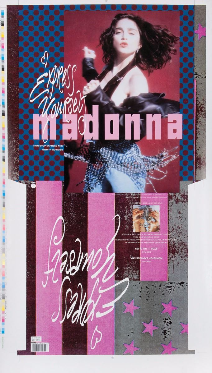 Excellent 1989 UK WEA full-color first proof artwork sheet for the UK 12? single of Madonna’s ‘Express Yourself,’ 15 x 26, featuring images for the front and back covers and including four color separation overlays for yellow, magenta, cyan, and black. Proofing bars, trim marks, and job numbers appear in the borders. In fine condition.