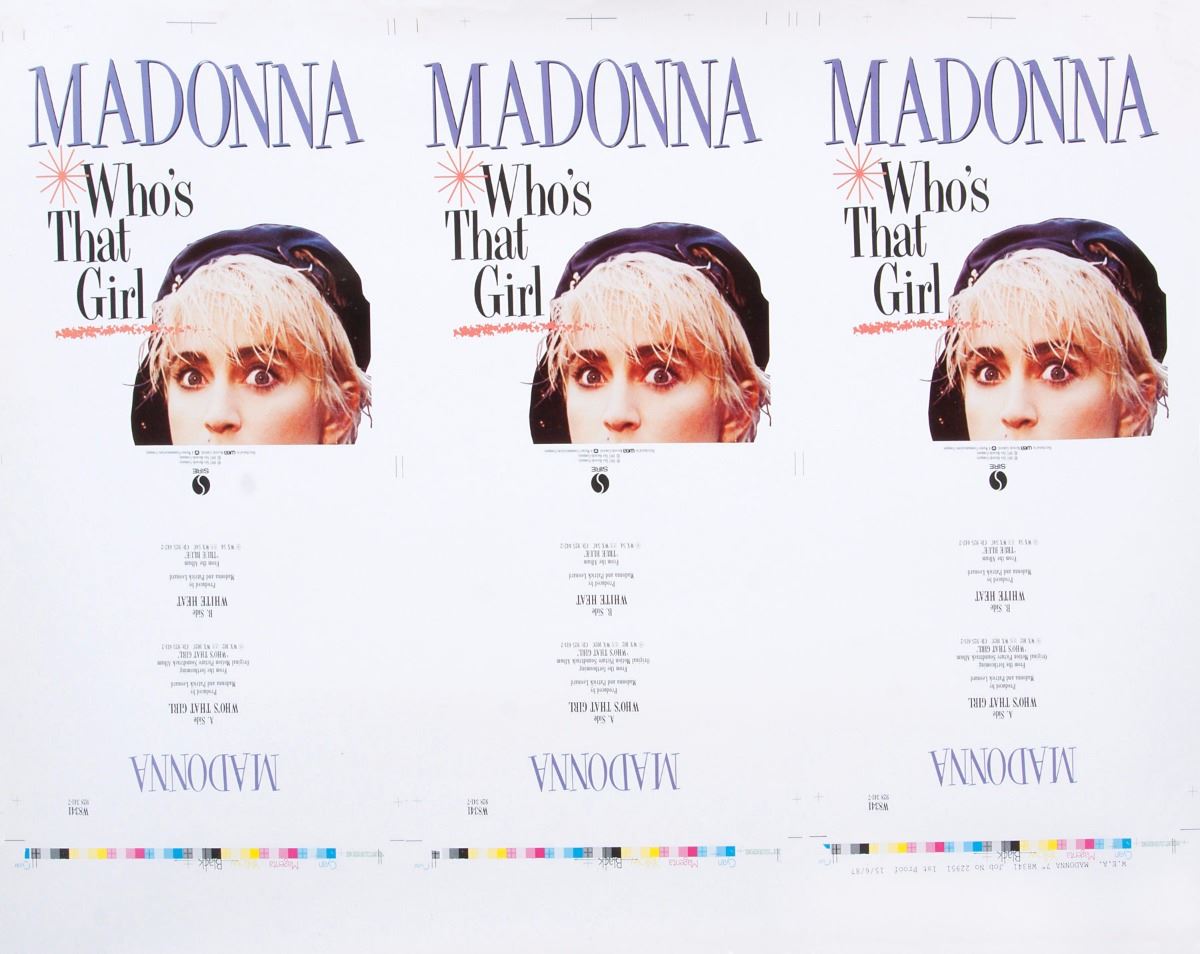 Impressive 1987 UK WEA set of two full-color original first proof artwork sheets for the UK 7? and 12? singles of Madonna’s ‘Who’s That Girl.’ The proof for the 7? cover measures 25.5 x 18 and features three identical images of the front and back covers; the proof for the 12? release measures 15 x 25.5 and features the front and back covers. Proofing bars, trim marks, and job numbers appear in the borders. In fine condition.