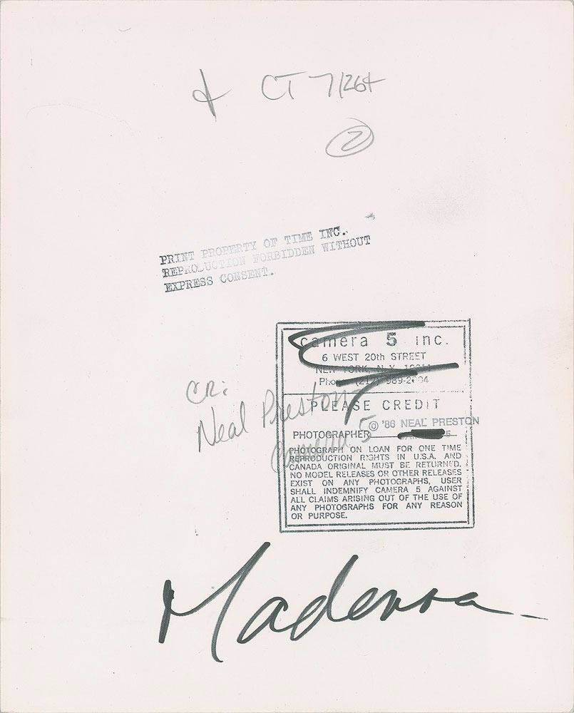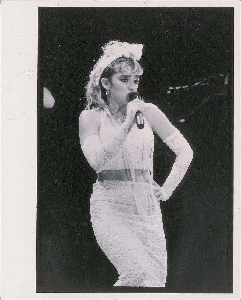 Original vintage matte-finish 8 x 10 silver gelatin photo of Madonna performing in a lacy white dress during the 1985 The Virgin Tour, her debut concert tour. Reverse bears a Neal Preston/Camera 5 Inc. credit stamp and 1986 copyright date. In fine condition.