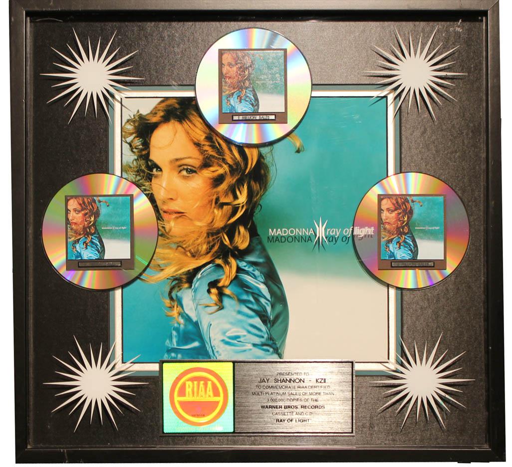 RIAA multi-platinum award for Madonna's ''Ray of Light'' album, presented to Jay Shannon -- KZII, for the sales of more than 3,000,000 CD's and cassettes. Framed award includes a poster of the album cover, three separate platinum-colored CD's with plaques noting sales in millions, and a commemorative plaque with an official RIAA (Recording Industry Association of America) hologram certifying the award. Frame measures 19.5'' x 18.5'', with minor scratches to frame and a small blue marker smudge to glass at lower right corner. Near fine.