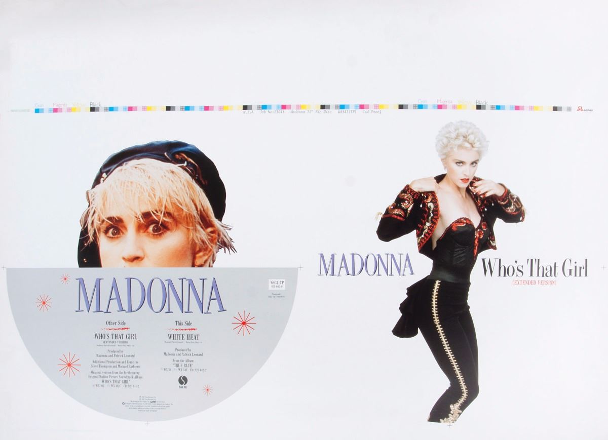 Fantastic set of three full-color original first proof artwork sheets for the limited edition UK 12? picture disc singles ‘Who’s That Girl,’ ‘The Look of Love,’ and ‘Express Yourself,’ each measuring 25 x 18, including proofing bars and trim marks in the borders. In fine condition. An extremely attractive set of rare artwork for classic Madonna singles.