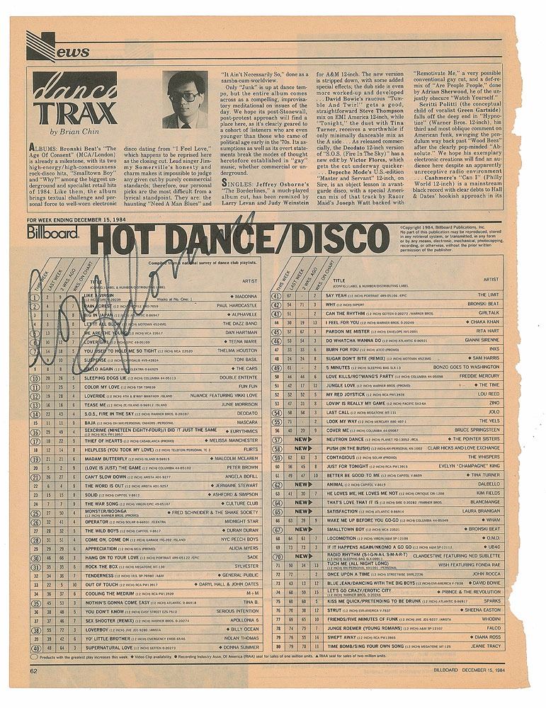 Hot Dance/Disco Top 80 page removed from a copy of Billboard from December 15, 1984, 11 x 14.5, signed in black felt tip, "Love, Madonna." The chart lists Madonna's 'Like a Virgin' in the very top spot. In fine condition. Accompanied by a full letter of authenticity from REAL.