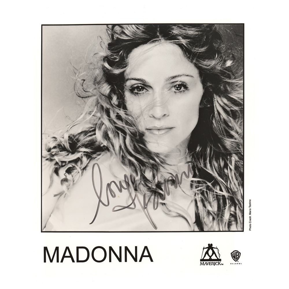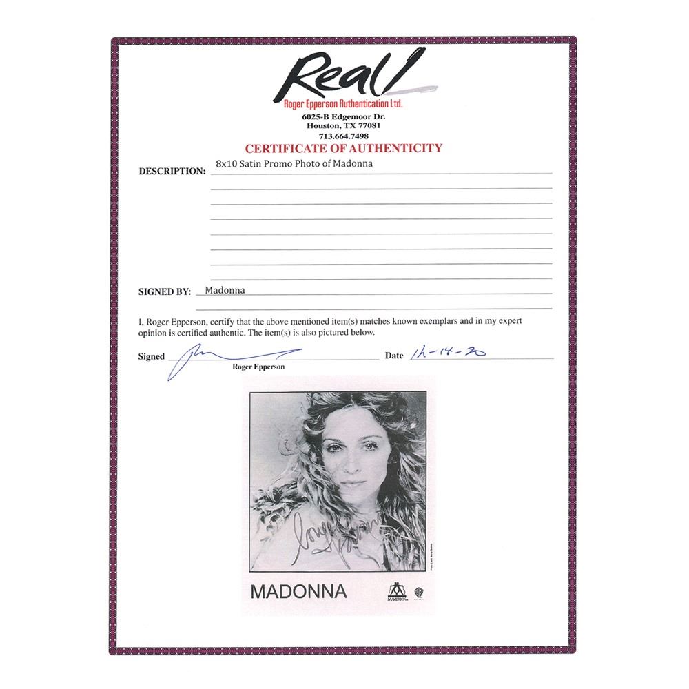 Satin-finish 8 x 10 Warner Bros. Records promo photo of the pop icon, signed in black felt tip, "Love, Madonna." In fine condition. Accompanied by a full letter of authenticity from REAL.