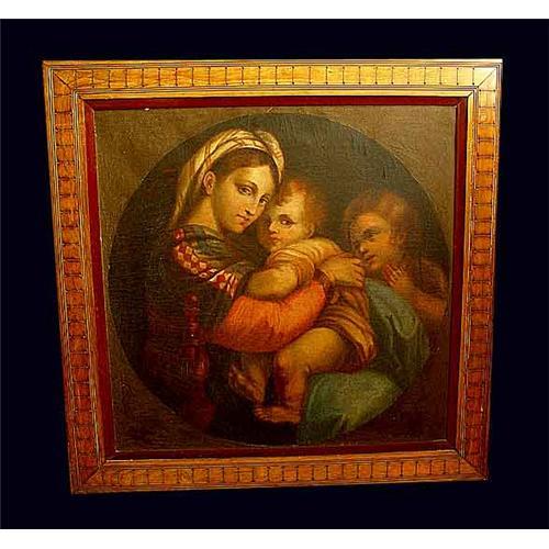 19th Century Virgin Mary and child oil painting after Madonna della Seggiola after RAFFAELLO Sanzio. This painting depicts the Virgin Mary, olding baby Jesus with an angel in the background. Housed in it?s original hand carved cherry wood frame. With a (recessed gallery). This piece would make a wonderful addition to any fine European art collection. Size: 30 x 30 inches (painting), 38 x 38 inches (frame)****NOTE: Email for larger images.