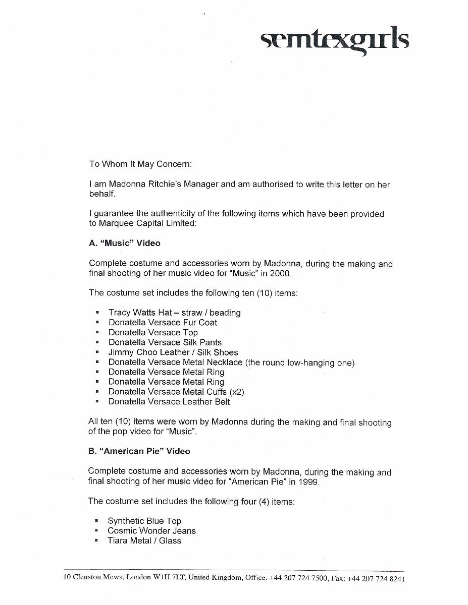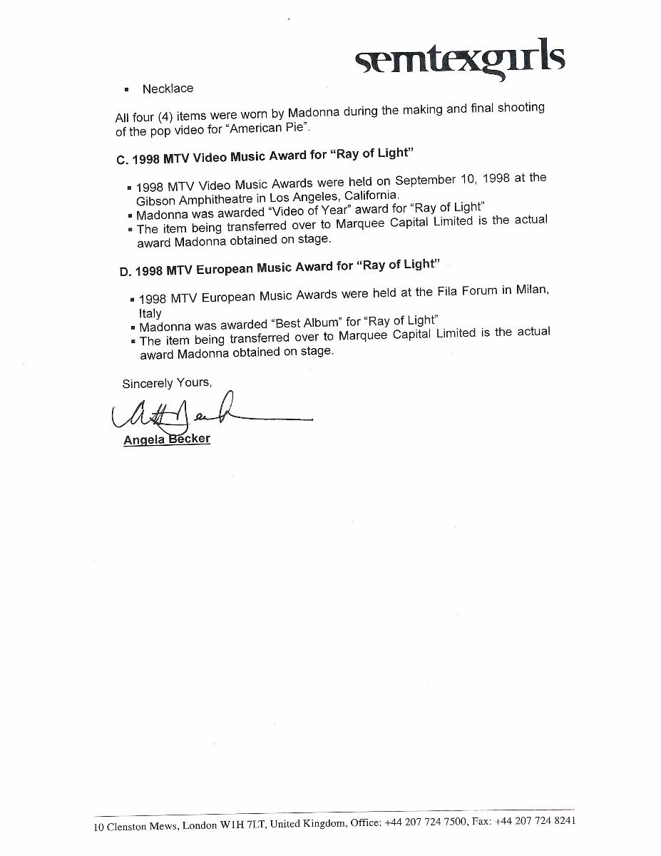 Madonna’s 1998 MTV Europe Music Award for Best Album, given in recognition of her album Ray of Light. The trophy features an engraved plaque on the front reading, “MTV Europe Music Awards, Italia 1998, Best Album, Madonna.” In fine condition. The 1998 MTV European Music Awards were held at the Fila Forum in Milan, Italy, and Madonna performed one of her hit singles from Ray of Light, ‘The Power of Good-Bye.’ The album went on to win four Grammy Awards the next year, including Best Pop Album.