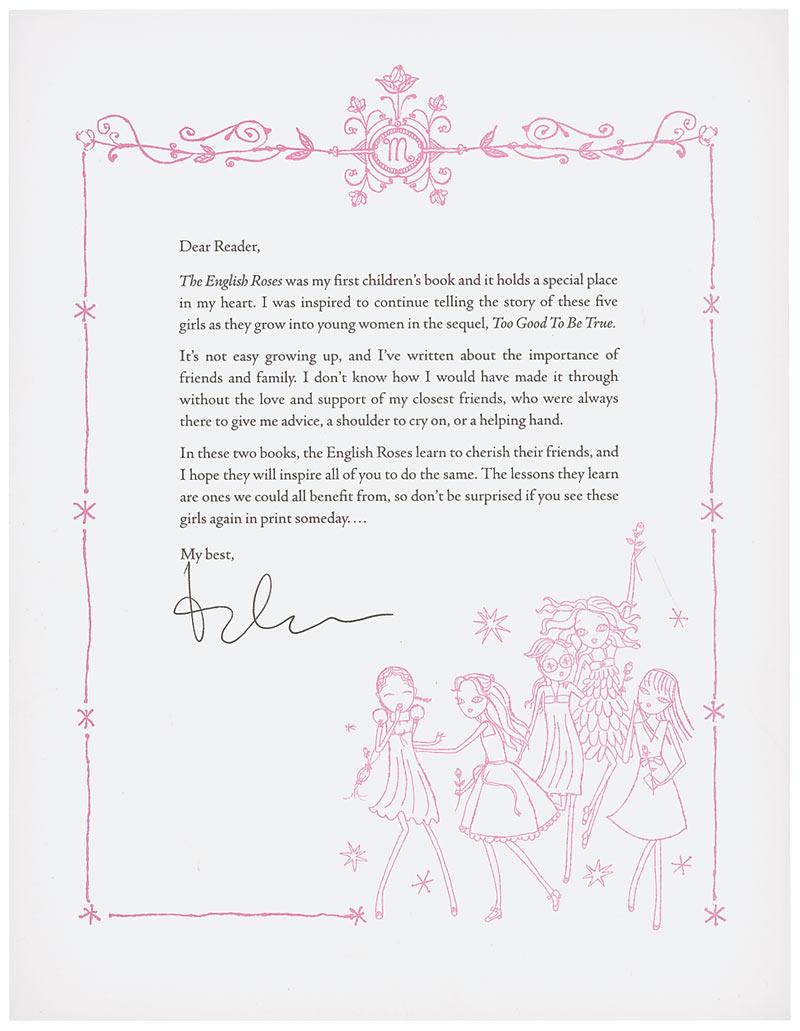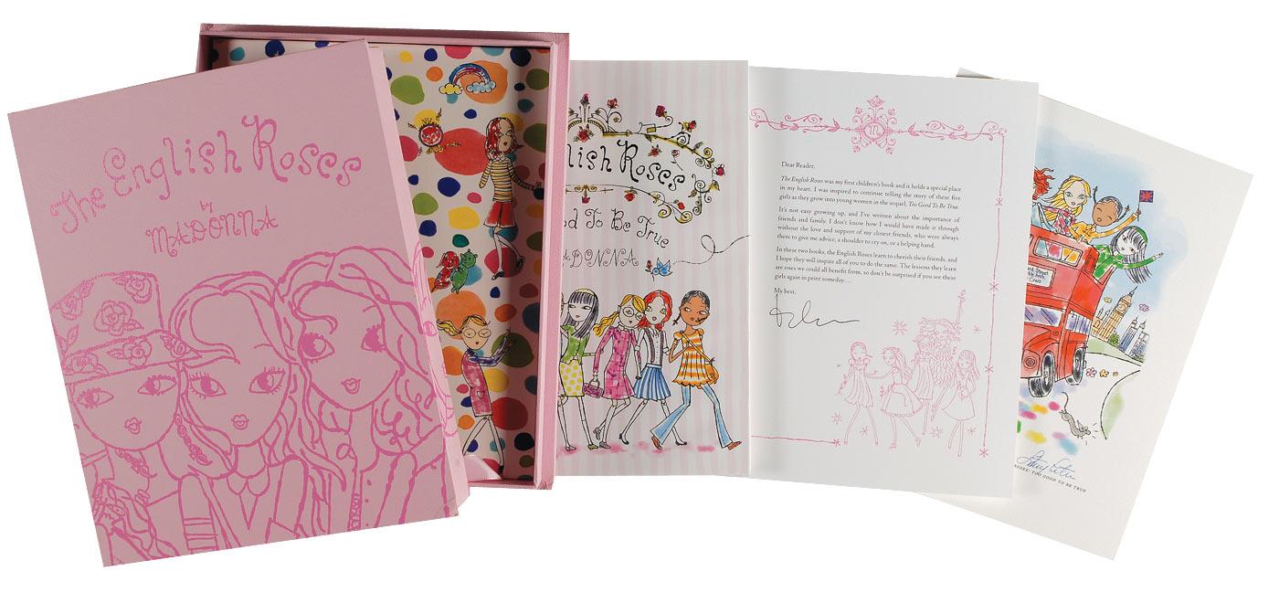 The English Roses Collection Limited Edition Boxed Set (Callaway Editions/Amazon.com, 2006), from an edition of 1,550 sets (this being no. 660), comprising unsigned first edition copies of the books The English Roses and The English Roses: Too Good to Be True, a giclée digital print signed by illustrator Stacy Peterson, and a TLS discussing the books, signed “Madonna,” all housed in the original printed cardboard box. In very fine condition.