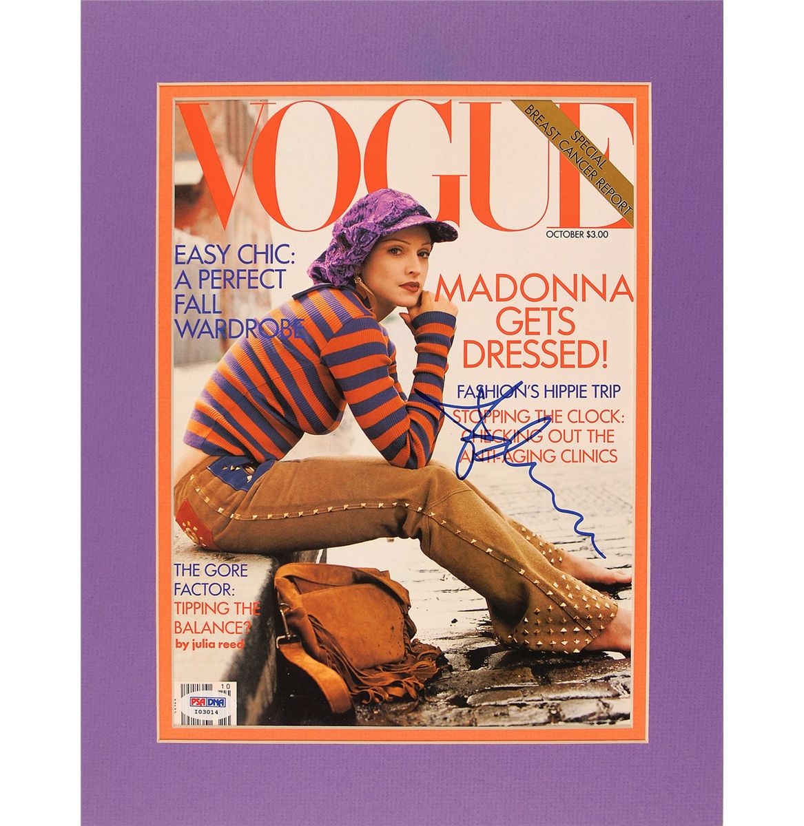 Magazine cover from the October 1992 issue of Vogue, 7.75 x 10.5, signed in blue felt tip. Double matted to an overall size of 11 x 14. In fine condition, with a PSA/DNA label affixed to the lower left corner. Accompanied by a full letter of authenticity from PSA/DNA.