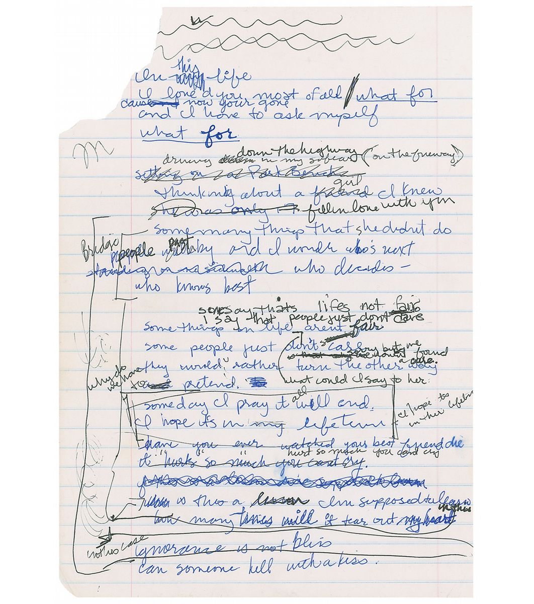 Handwritten working lyrics to Madonna’s song ‘In This Life,’ recorded for her 1992 Erotica album, on a 7.5 x 10.5 lined sheet, signed with her initial in the left border, “M.” In blue ballpoint and black ink, Madonna writes out and edits about 27 lines of lyrics for the song, in part (with grammar and spelling retained): “In this life/ I loved you most of all/ What for/ cause now your gone/ and I have to ask myself/ What for…Some say thats lifes not fair/ I say that people just don’t care/ some things in life aren’t fair/ some people just don’t care/ they would rather turn the other way/ Why do we have to pretend/ What could I say to her/ some day I pray it all will end/ I hope it’s in my lifetime/ I hope its in this lifetime.” She has also added a few doodles, seemingly to test her pen, in the margins. A few light creases, and paper loss to the upper left corner (affecting none of the lyrics), otherwise fine condition. Madonna wrote ‘In This Life’ in memory of friends who she had lost to AIDS, becoming track 12 on Erotica, which explored many areas of sexuality. The release of the album and its accompanying book, Sex, caused worldwide backlash due to their explicit nature. However, the controversy has cemented Erotica’s legacy in popular culture—critics today see this album as Madonna at her most socially relevant.