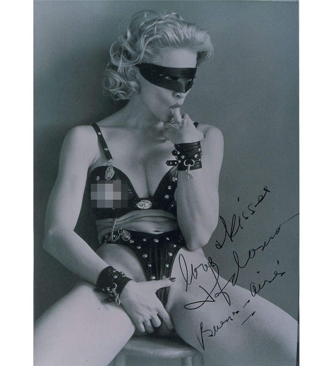 Provocative glossy 5 x 7 photo of Madonna clad in leather and suggestively posed, signed in black felt tip, “Love & Kisses, Madonna, Buenos Aires.” Reverse bears a couple of news agency stamps, and notations in English and Spanish that state the photo was signed on December 8, 2008, at a tango gala in San Telmo, Buenos Aires, Argentina. In fine condition, with a light surface mark to the right side and lightly trimmed edges.