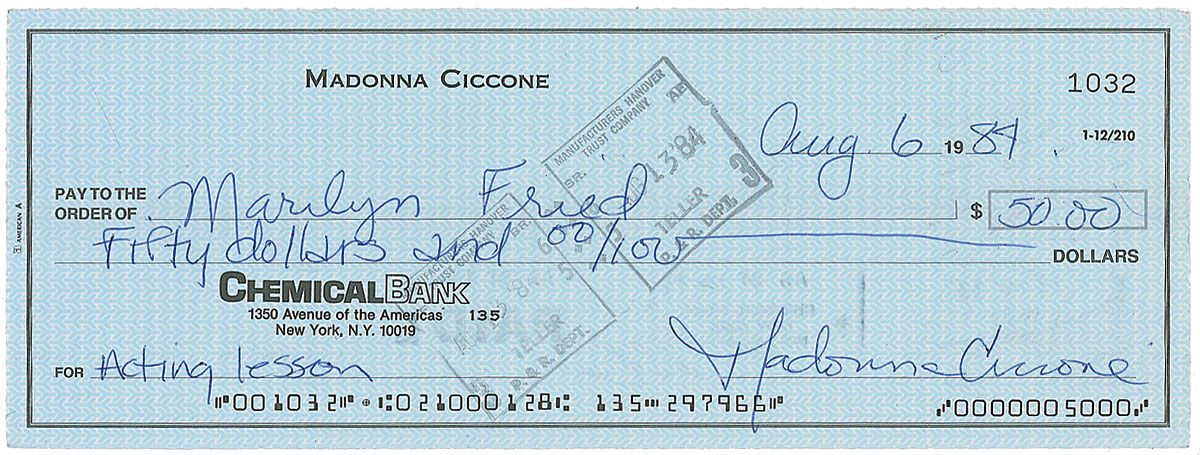 Personal check, 8.25 x 3, filled out and signed by Madonna, “Madonna Ciccone,” payable to Marilyn Fried for $50.00, August 6, 1984, with Madonna adding, “Acting lesson,” on the memo line. In fine condition, with two vertical folds, one through a single letter of signature, and expected stamps to body. Madonna was preparing for her first feature role in Desperately Seeking Susan, having made her mainstream theatrical debut in Vision Quest filmed in 1984.