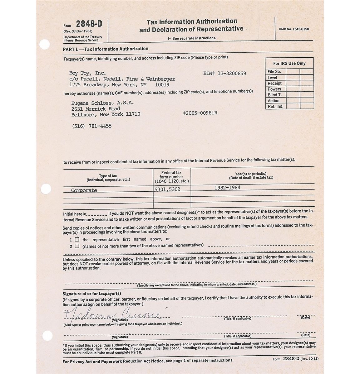 DS, signed “Madonna Ciccone,” two pages, 8.5 x 11, no date. IRS form 2848-D Tax Information Authorization and Declaration of Representative form, for Madonna’s Boy Toy, Inc. company, authorizing Eugene Schloss “to receive from or inspect confidential tax information in any office of the Internal Revenue Service,” to inspect her corporate taxes. Signed at the conclusion by Madonna, using her rarely seen full name. In fine condition, with a paperclip impression to top edge. An early document from the entertainer’s quickly growing international empire, bearing her seldom-seen full legal name.