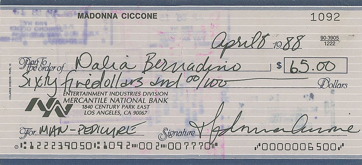 Personal check, 6 x 2.5, filled out and signed by Madonna, “Madonna Ciccone,” payable to Dalia Bernadino for $65.00, April 8, 1988. Memo line reads, “Man-Pedicure.” Show-through from stamps on reverse and a light central vertical fold, otherwise fine condition.