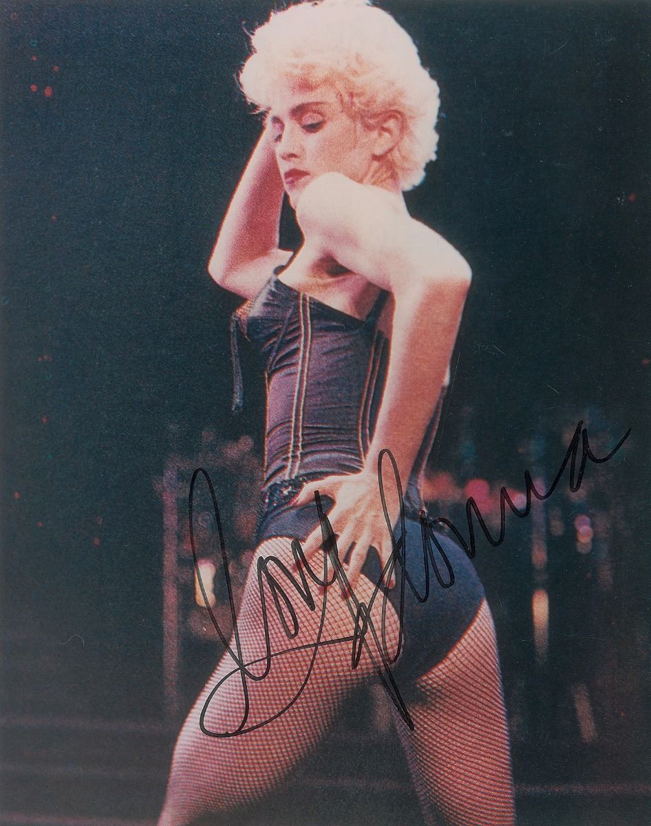 Color satin-finish 8 x 10 photo of Madonna in a suggestive pose, signed in black felt tip, “Love, Madonna.” In fine condition, with some light contrast to the signature against dark areas of the background.