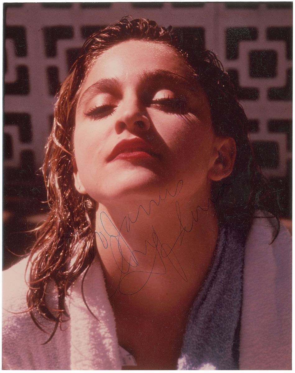 Color glossy 8 x 10 photo of Madonna, signed and inscribed in blue ballpoint, “To James, love, Madonna.” In fine condition. Accompanied by a full letter of authenticity from PSA/DNA.