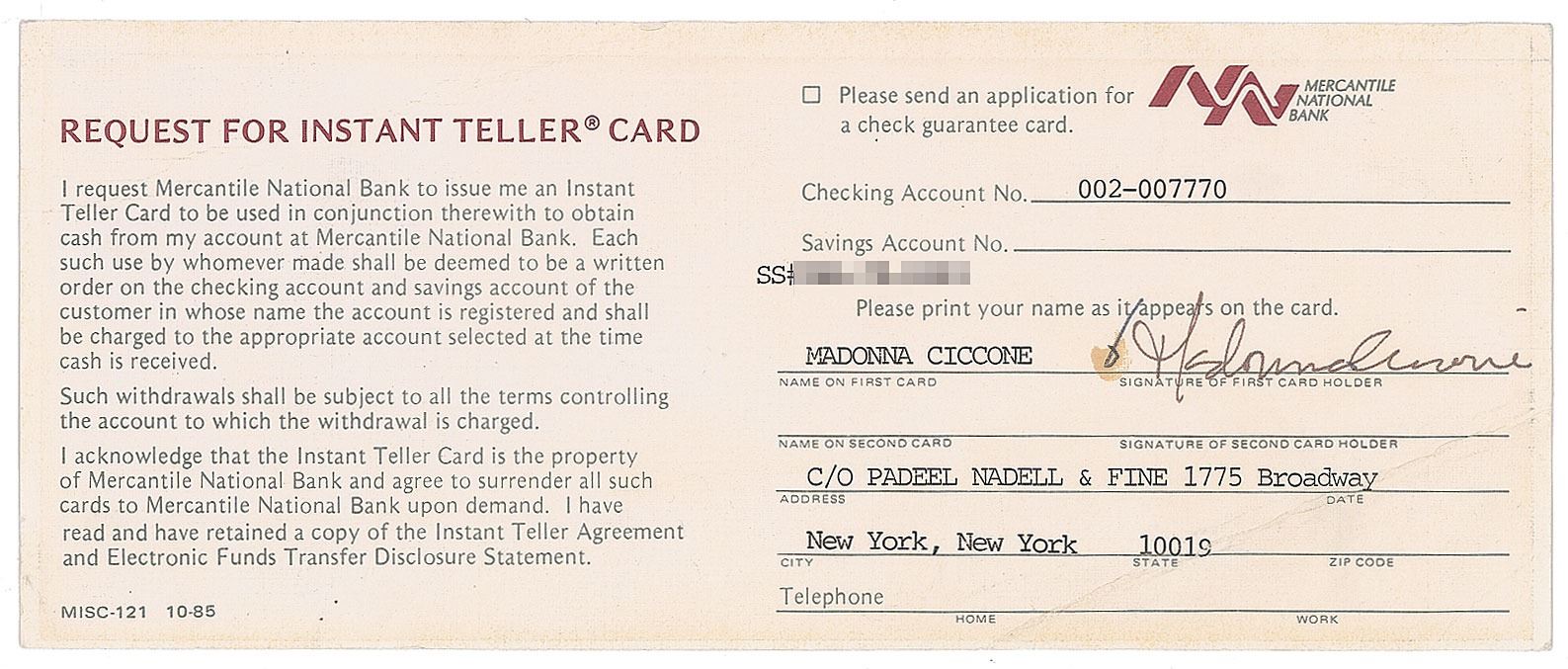 Partly-printed DS, signed “Madonna Ciccone,” one page, 8.5 x 3.5, no date but circa mid-to-late 1980s. Application for an instant teller card from the Mercantile National Bank, signed in ink by Madonna using her full legal name. In very good to fine condition, with several diagonal creases.