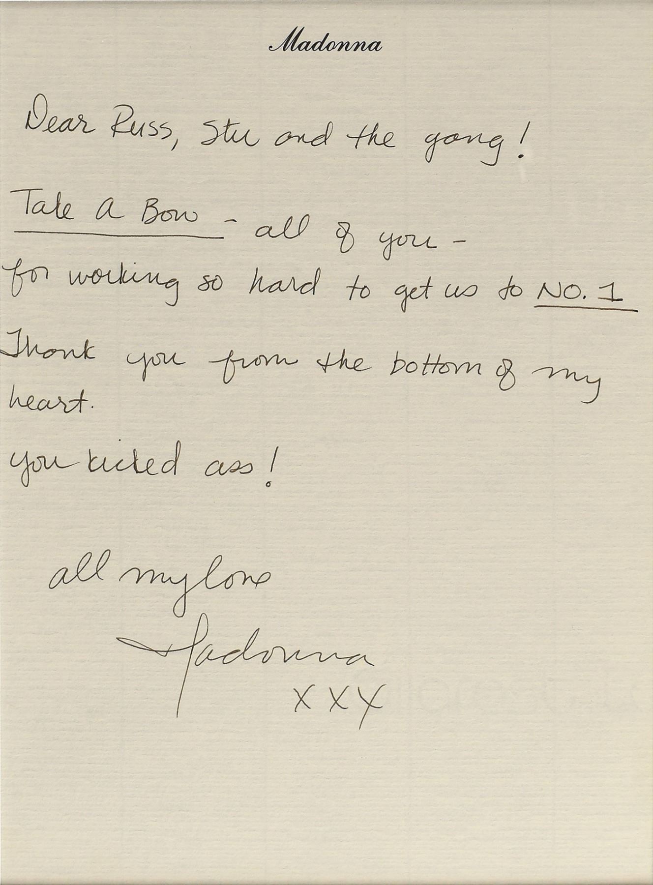 ALS, one page, 7 x 9.25, personal letterhead, no date [circa 1994]. Madonna writes to "Russ, Stu, and the gang." In full: "Take a Bow—all of you—for working so hard to get us to No. 1. Thank you from the bottom of my heart. You kicked ass! All my love." The song "Take a Bow," which was released in late 1994 and spent seven weeks at number one on the American charts, remains the singer's biggest hit single. Attractively matted and framed with an unsigned photo and engraved plaque to an overall size of 24 x 23.75. In very fine condition.