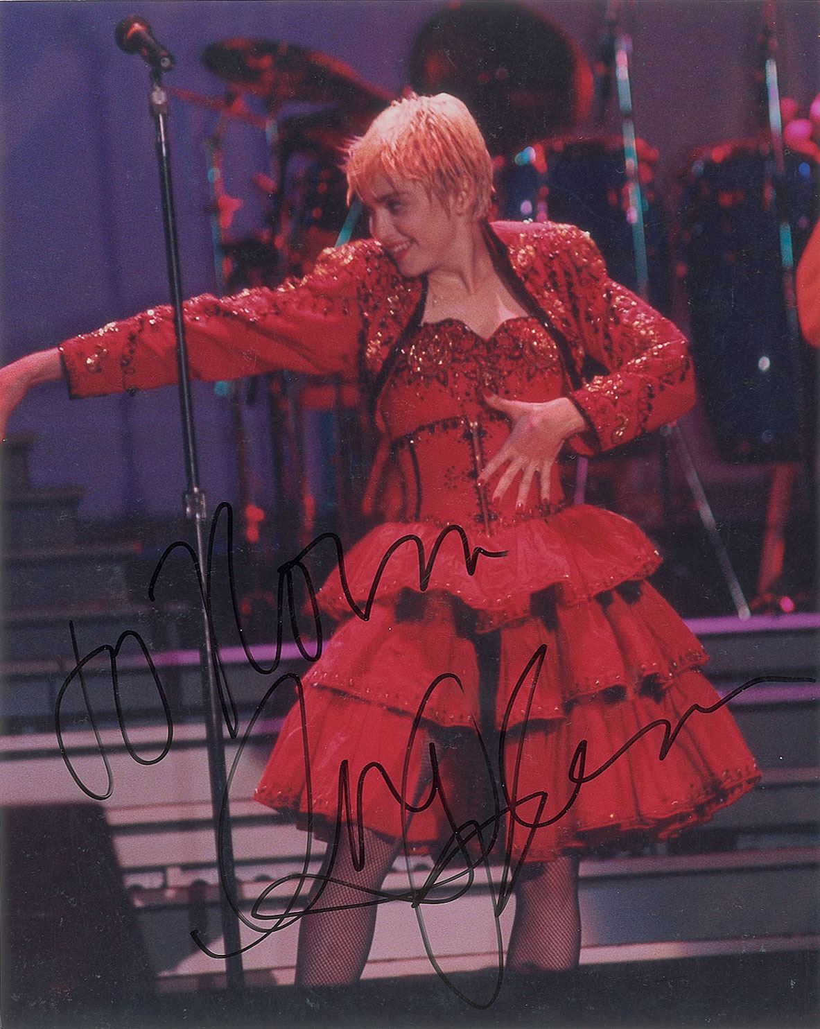 Attractive color glossy 8 x 10 photo of Madonna striking a pose on stage during the mid-1980s, signed in black felt tip. In very good to fine condition, with light scuffing, and three light dings along the left edge. Accompanied by a full letter of authenticity from JSA.