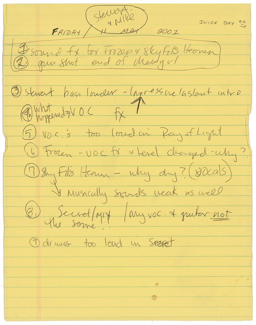 Unsigned handwritten concert notes from the Drowned World Tour, one lightly-lined yellow page, 8.5 x 11, 2001. Comments include “gun shot end of Material girl” and “VOC’s too loud in Ray of Light.” Affixed to an identical size sheet of light cardstock. In fine condition, with a few wrinkles. She has added a small doodle at top edge. Pre-certified PSA/DNA and RRAuction COA.
