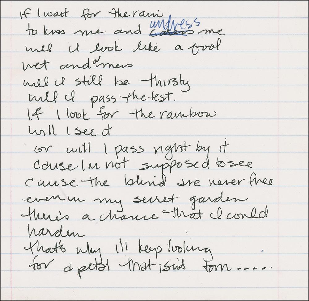 Unsigned lyrics, sixteen lines on a 6.25 x 6 lightly-lined sheet. In part: “If I wait for the rain to kiss me and undress me…will I still be thirsty, will I pass the test. If I look for the rainbow will I see it or will I pass right by it, cause I’m not supposed to see, cause the blind are never free, even in my secret garden.” She has made a suggestive correction, changing “caress” to “undress.” In fine condition, with light crease and wrinkling to one corner. Pre-certified PSA/DNA and RRAuction COA.