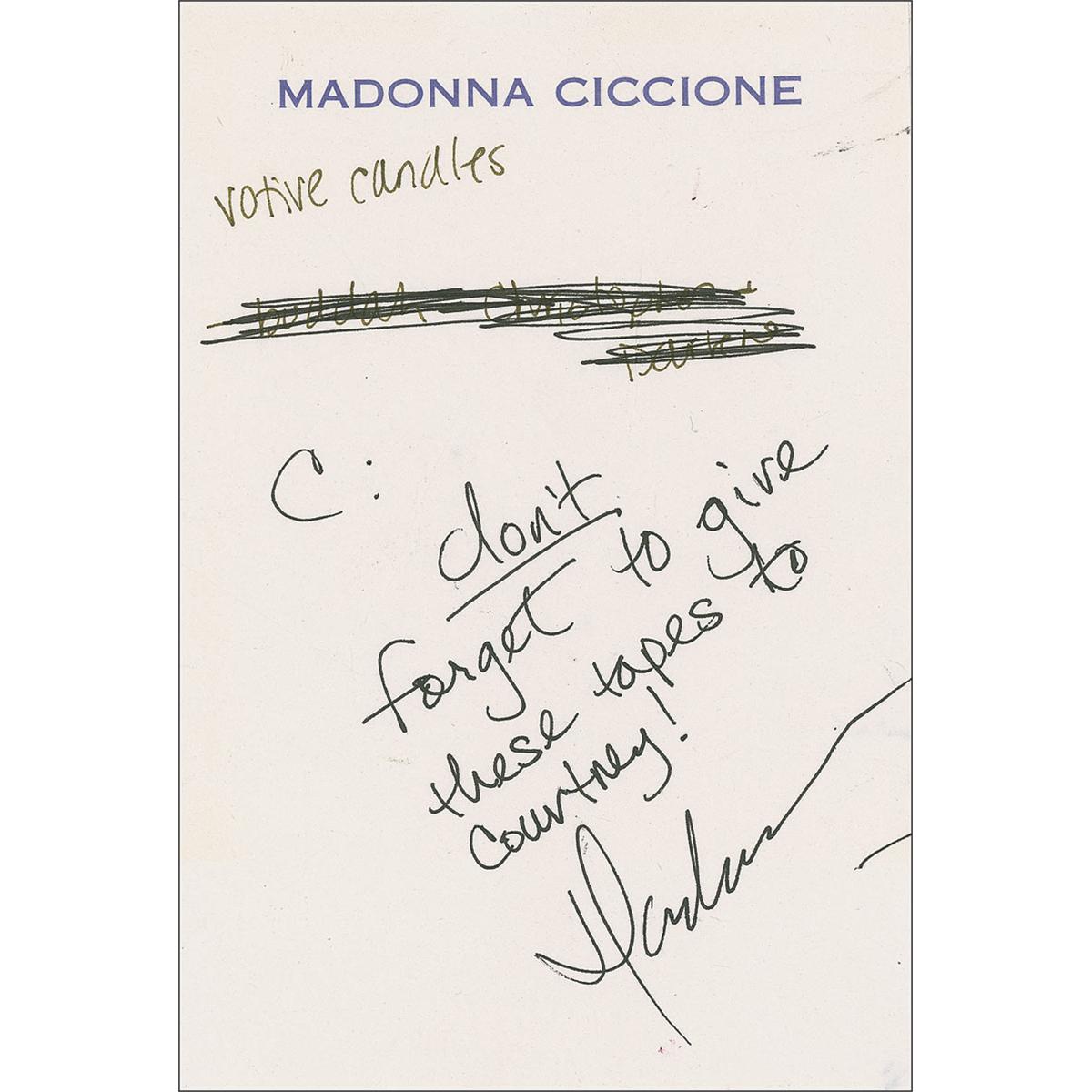 ANS, one page, 4 x 6, Madonna Ciccione letterhead. Detailing tasks for an assistant. In full: “Don’t forget to give these tapes to Courtney!” (According to our consignor, Madonna is referring to Courtney Love). In fine condition, with mild creasing and a few words crossed out.