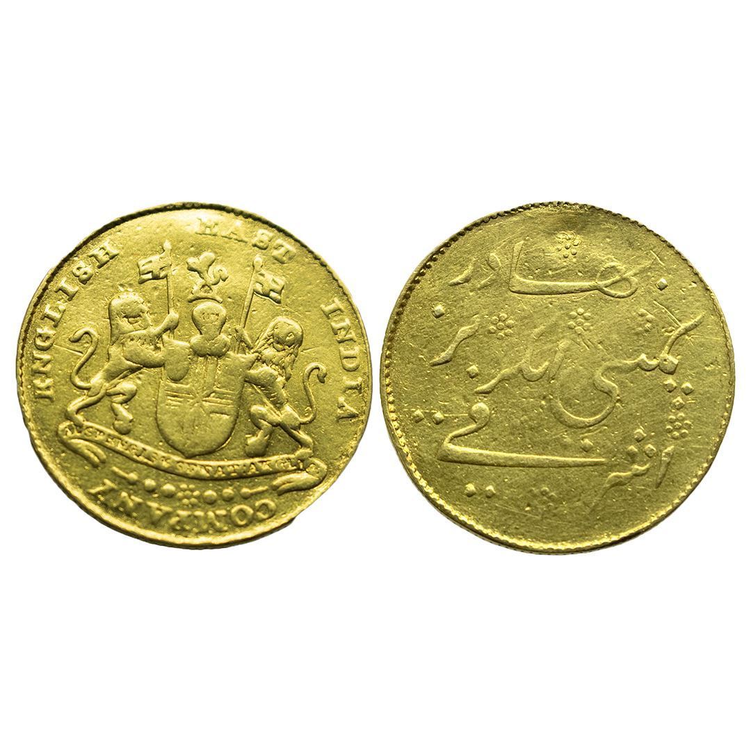 Madras Presidency, Gold Mohur (Ashrafi), 11.21Grms, ND (1819), Obv: Coat of arms of the East India Company, Rev: Value in Persian with Company angrez bahadur legend. (KM # 421.1).