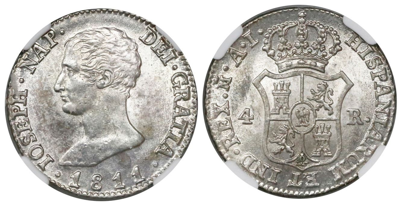 Madrid, Spain, 4 reales de vellon, Joseph Napoleon, 1811AI, encapsulated NGC MS 63.