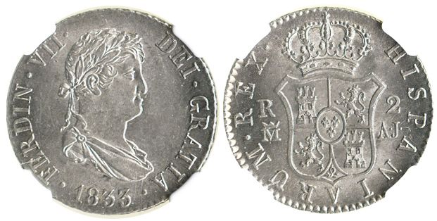 Madrid, Spain, bust 2 reales, Ferdinand VII, 1833AJ, encapsulated NGC MS 63. KM-460.2; CT-936. Exceptionally lustrous and choice, second finest known specimen graded by NGC, and final year of issue.