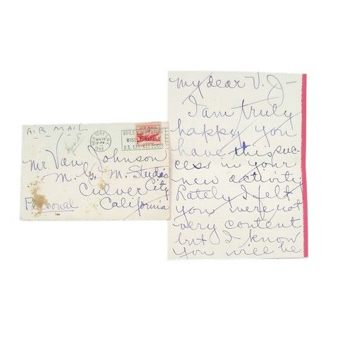 Mae Murray Personal Handwritten Letter - Before Mary Pickford, or any of the groundbreaking actresses who made the "Sliver Screen" their golden chariot, the very first true film sex-symbol was Mae Murray. She created the iconic look and style of true American woman beauty of the day with her trademark "Bee-Stung" Lips, and made millionaires of the makers of lip stick, which at the time was a new "invention". The famous bright red "puckered lip" is still popular today (one can only think of "Rocky Horror Picture Show"). Murray began working in film in 1916 and immediately became a major star. One of her first leading men in fact was the legendary Rudolph Valentino, who was known to tell his friends that Murray was the only women who truly intimidated him with her powerful sexual allure. She was also the first actress to branch out and form her own production company, realizing the future of the motion picture industry, when others still considered it a novelty and a "passing fad". She also knew her limitations, and withdrew from the limelight soon after talkies began. However she remained great friends with Hollywood's élite who always respected her. One of her best friends was actor Van Johnson. This is an extremely rare handwritten letter from Mae Murray in her trademark extra large script from 1953. She is congratulating Van on being cast in the feature film version of the hit Broadway musical "Brigadoon". Murray, who had been a chorus girl dancer and then a headliner in the Ziegfeld Follies 1908 knew a thing or two about "huffing", and wanted Van to know it would be a great joy for him, as it was for her way back when, to not only act, but now sing and dance in the film. The letter was in response to Van's insecurity and major concerns about doing the part. Especially having to co-star with Gene Kelly! The letter is hand addressed by Murray to Johnson at MGM Studios where he was filming the musical, and is postmarked from New York on April 25th, 1953, and includes her handwritten return address. She also wrote "PERSONAL" on the envelope. The letter comes from Van Johnson’s personal collection, and includes a Letter of Provenience from the Johnson’s daughter, Schuyler Johnson along with a copy of her famous controversial cover story article “My Life As A Hollywood Princess”, about her trials and tribulations growing up in Beverly Hills with a superstar father and extended “family” with some of the most famous celebrities in the world.