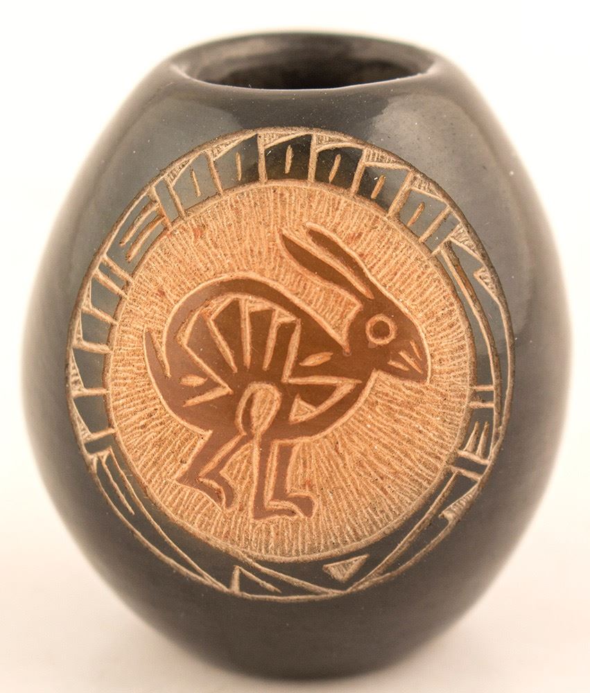 Mae Tapia sgraffito jar with Mimbres rabbit design, 1.75" h x 1-3/8" diameter. Mae Tapia-Suazo was born into Santa Clara Pueblo in 1956. Her mother, Santanita Suazo, says Mae got interested in working with clay when she was about seven so Santanita taught her the fundamentals of making pottery. Among her relatives are sister Candelaria Suazo and aunts Dolores Curran and Geri Naranjo. Mae specializes in creating red on black miniatures.