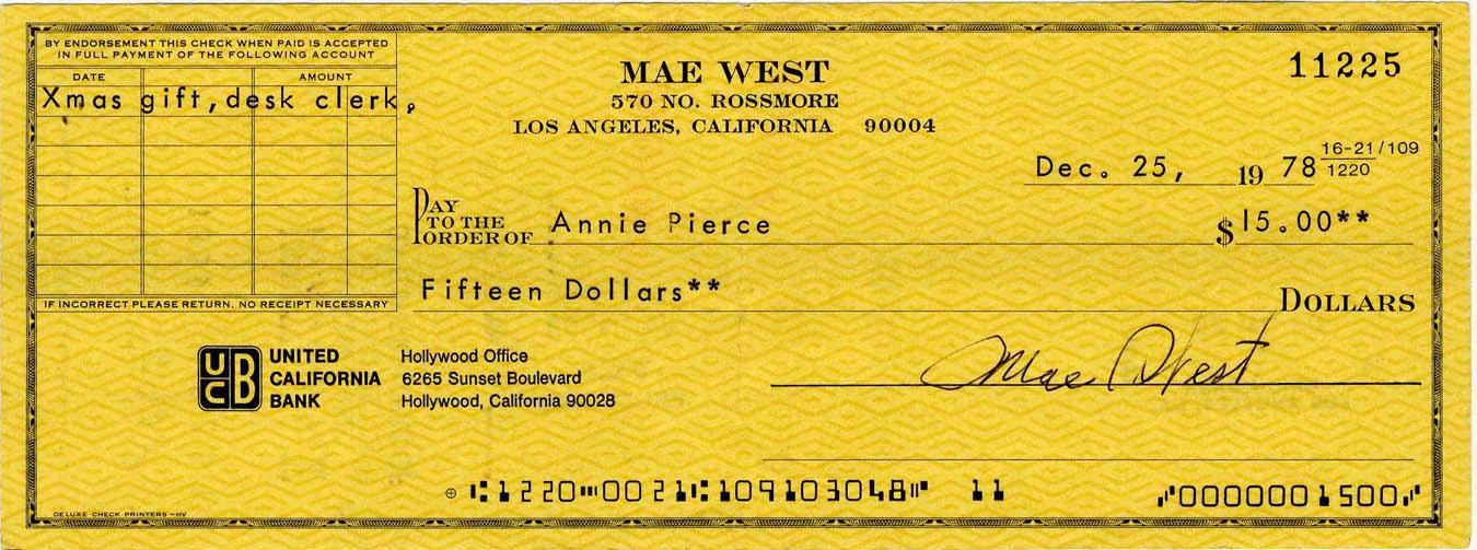Mae West Signed Check, Dated Christmas, 1978 -- Notated as "Xmas gift, desk clerk" -- 8.25" x 3" -- Near Fine Condition