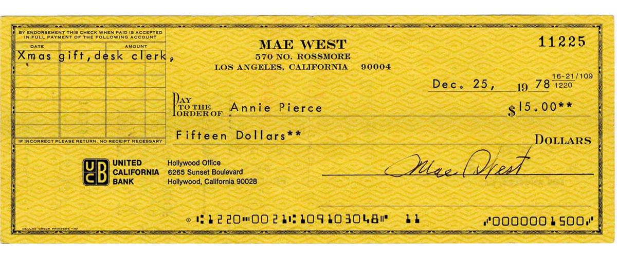 Mae West check signed. West's personal United California Bank check bears her printed name and Rossmore address in Hollywood and is signed ''Mae West''. A typed notation identifies the $15 as a ''Xmas gift, desk clerk''. Made out to Annie Pierce and dated 25 December 1978. Measures 8.25'' x 3''. Near Fine.