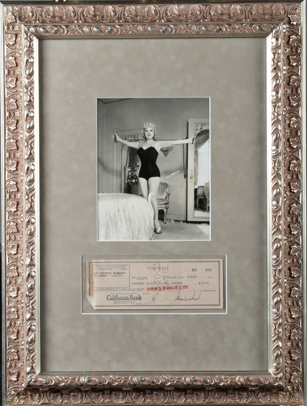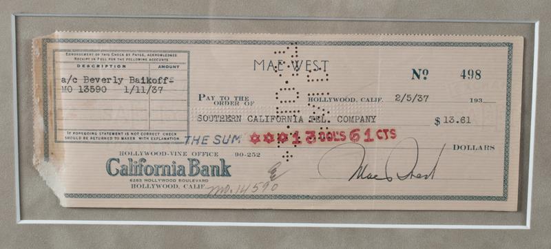 Matted and framed behind glass, includes a photo of Mae West with arms outstretched. Below is a signed check from Mae West to the Southern California Tel. Company for $13.61, dated 2/5/37. 26" H x 19.5" W, including frame. COA from Always Authentic Autographs included.