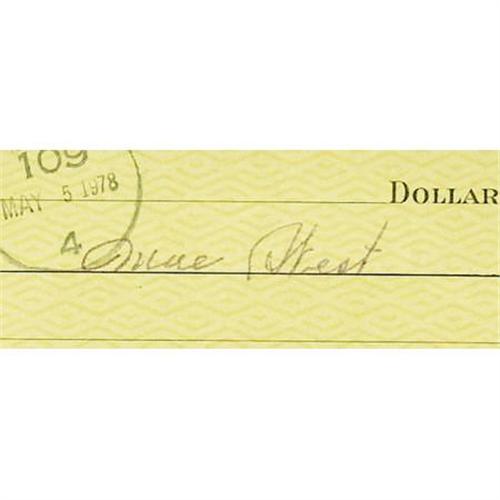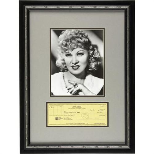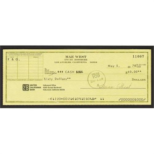 <B>Mae West Signed Check with Photo.</B></I> "It's better to be looked over than overlooked" once quipped actress Mae West, whose frank and open sexuality was an almost constant source of controversy. Featured here is a personal check dated May 5, 1978, written for $60 in cash and signed by West in black ink. It is in great condition with an approximately 1" tear near the bottom edge, and has been matted and framed along with a b&w 8" x 10" photo of the gorgeous actress, to an overall size of 16" x 21". <I>Accompanied by LOA from PSA/DNA.</B></I><BR><BR><b>Shipping:</b> Framed - with Glass, Medium (<a target="_blank" href="http://www.heritageauctions.com/common/shipping.php">view shipping information</a>)