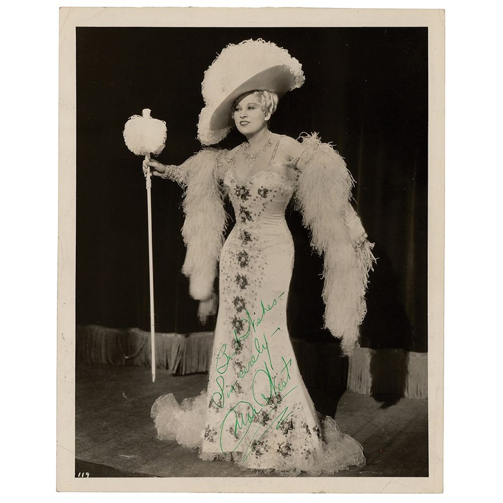 Vintage glossy 7.75 x 9.5 full-length photo of Mae West as Lady Lou in the 1933 film She Done Him Wrong, signed in green ink, "Best wishes-Sin-cerely-Mae West." In fine condition, with scattered light creasing. Accompanied by a certificate of authenticity from JSA.