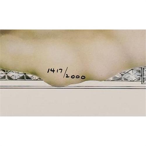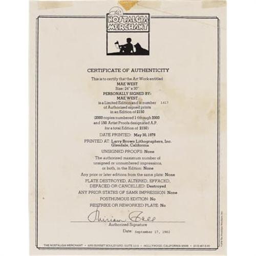 <B>Mae West Signed Poster (Nostalgia Merchant, 1978).</B></I> A renowned actress, comedienne, and singer, Mae West was also one of the grandest and most controversial sex symbols of the Golden Age of Hollywood. This 24" x 30" commemorative poster is inscribed "Sincerely, Mae West" in black marker near the bottom, and is in Fine condition with some heavy soiling and creasing along the left edge. It is number 1,417 in a limited edition of 2,000. <I>Accompanied by a certificate of authenticity from The Nostalgia Merchant.</B></I> <I>Accompanied by LOA from PSA/DNA.</B></I><BR><BR><b>Shipping:</b> Flat Material, Large (<a target="_blank" href="http://www.heritageauctions.com/common/shipping.php">view shipping information</a>)