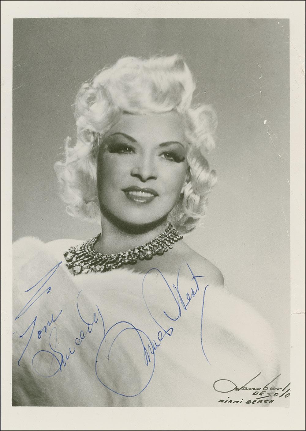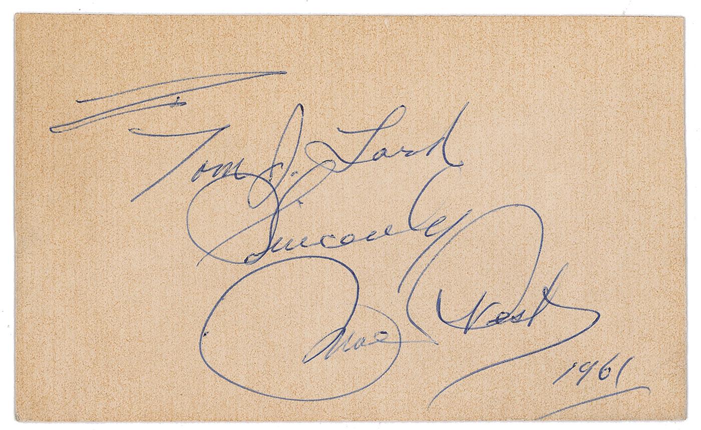 Vintage 4.75 x 7 photo of West, signed and inscribed in blue ink, “To Tom, Sincerely, Mae West”; and a vintage ink signature and inscription, “To Tom J. Lord, Sincerely, Mae West, 1961,” on an off-white 5.5 x 3.25 card. In very good condition, with creasing to photo and toning to card. Accompanied by the original mailing envelope.