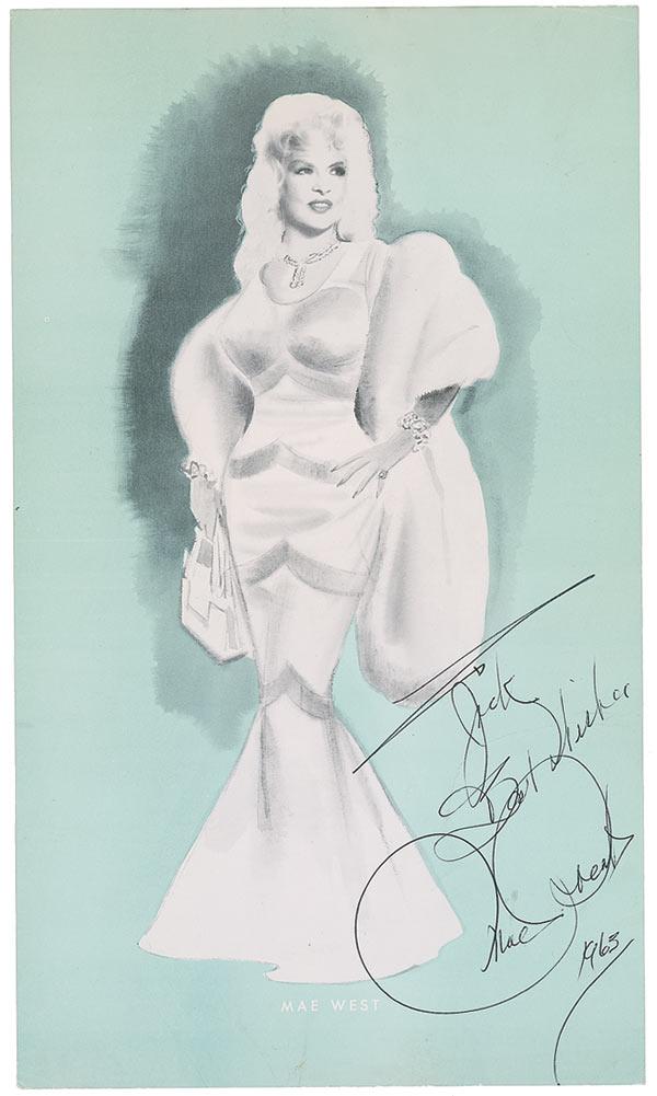 Color 6.5 x 11 cardstock full-length photo, signed and inscribed in ballpoint “To Jack, Best Wishes, Mae West 1963.” In fine condition, with a few creases, spots of soiling, and trimmed edges.