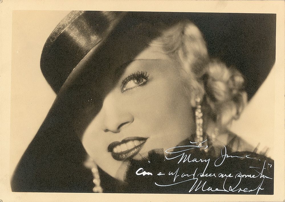 Vintage matte-finish 7 x 5 photo, signed and inscribed in white ink “To Mary Jane, ‘Come up and see me sometime’ Mae West.” In fine condition.