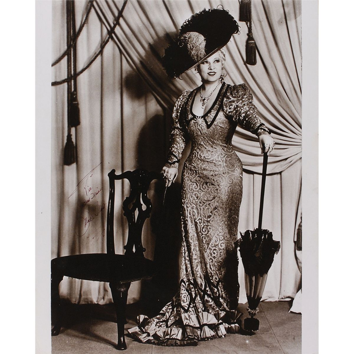 Mounted 15.75 x 19.5 cardstock photo of West in a lovely sequined dress, signed and inscribed in black felt tip, “To Vic, Best Wishes, Mae West.” Scattered creases (with one extending from the top edge through her hat), and slight irregular ink adhesion, otherwise fine condition.