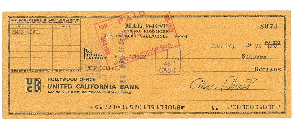 Personal check, 8.25 x 3, filled out in type and signed by West, payable to R. C. Ashley for $10, stamp-dated December 24, 1972. In fine condition, with expected bank notations and stamps.