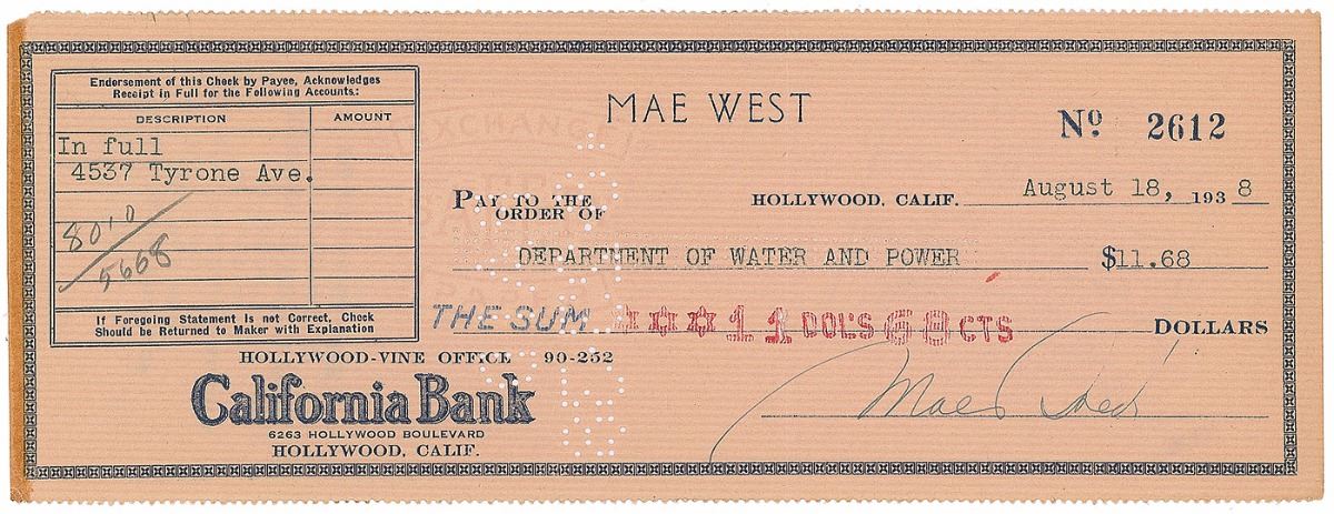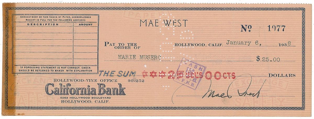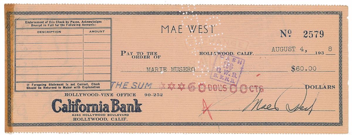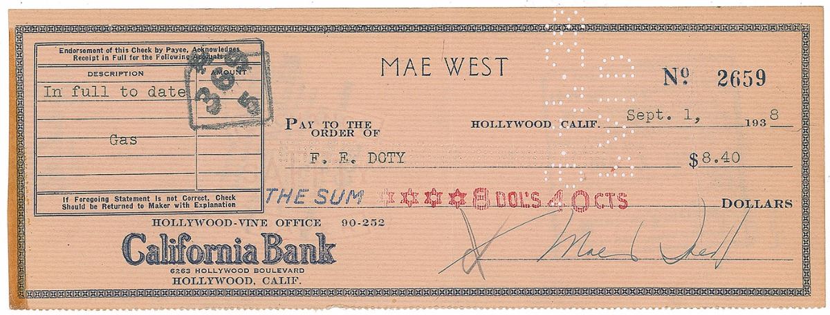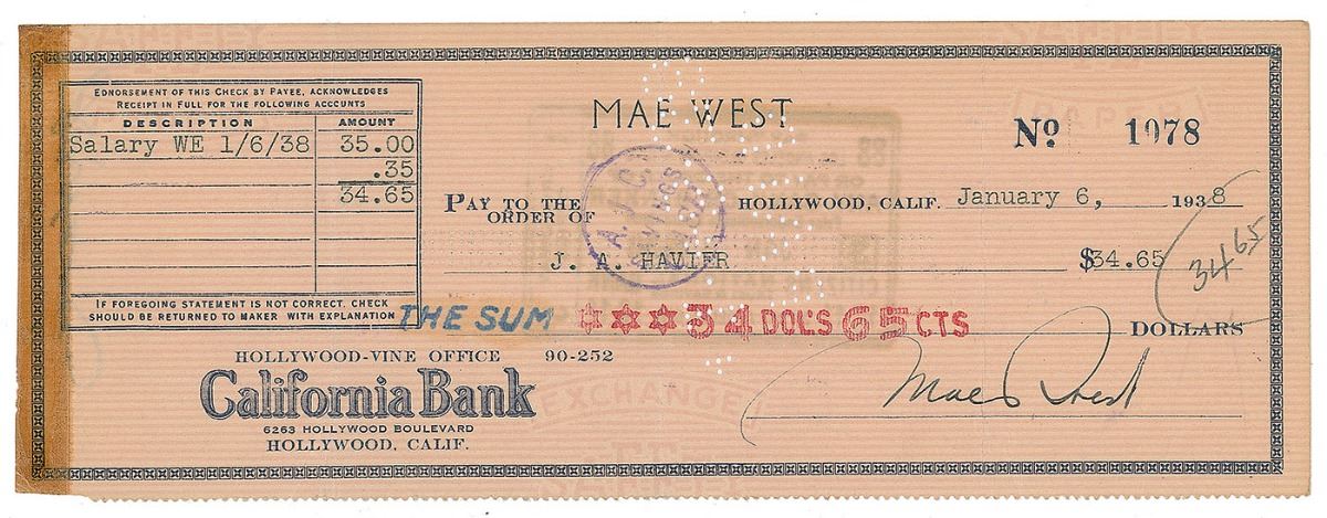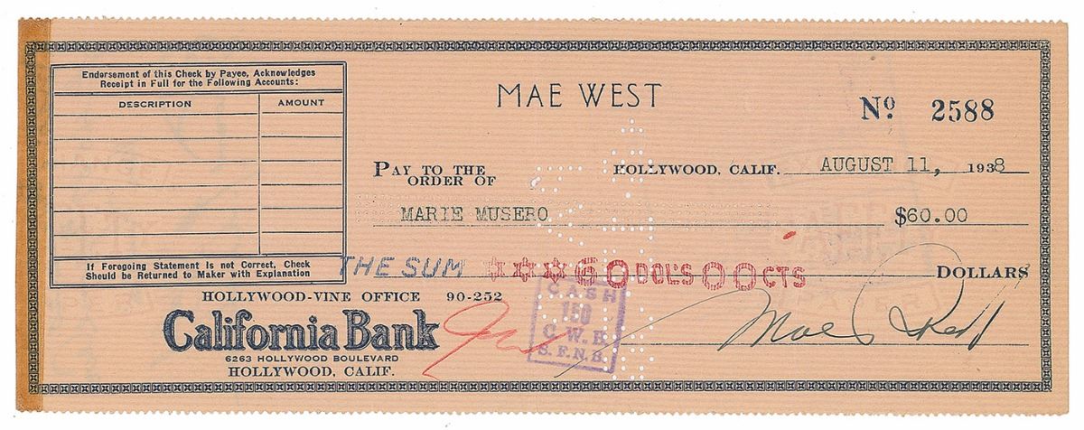 Six personal checks, each 8.5 x 3.25, filled out in type and signed by West, stamp-dated between January and September 1938. In overall fine condition, with a strip of old tape along the left edge of each check.