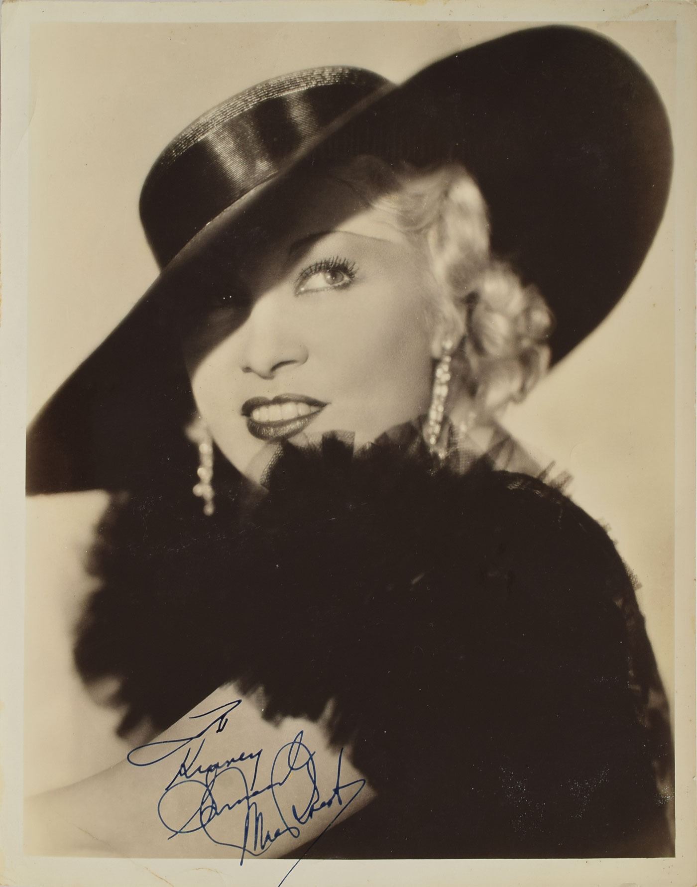 Vintage glossy 8 x 10 photo of West wearing diamonds and a black outfit, signed and inscribed in fountain pen, "To Kinney, Sincerely, Mae West.” In very good to fine condition, with scattered creasing and scuffing.