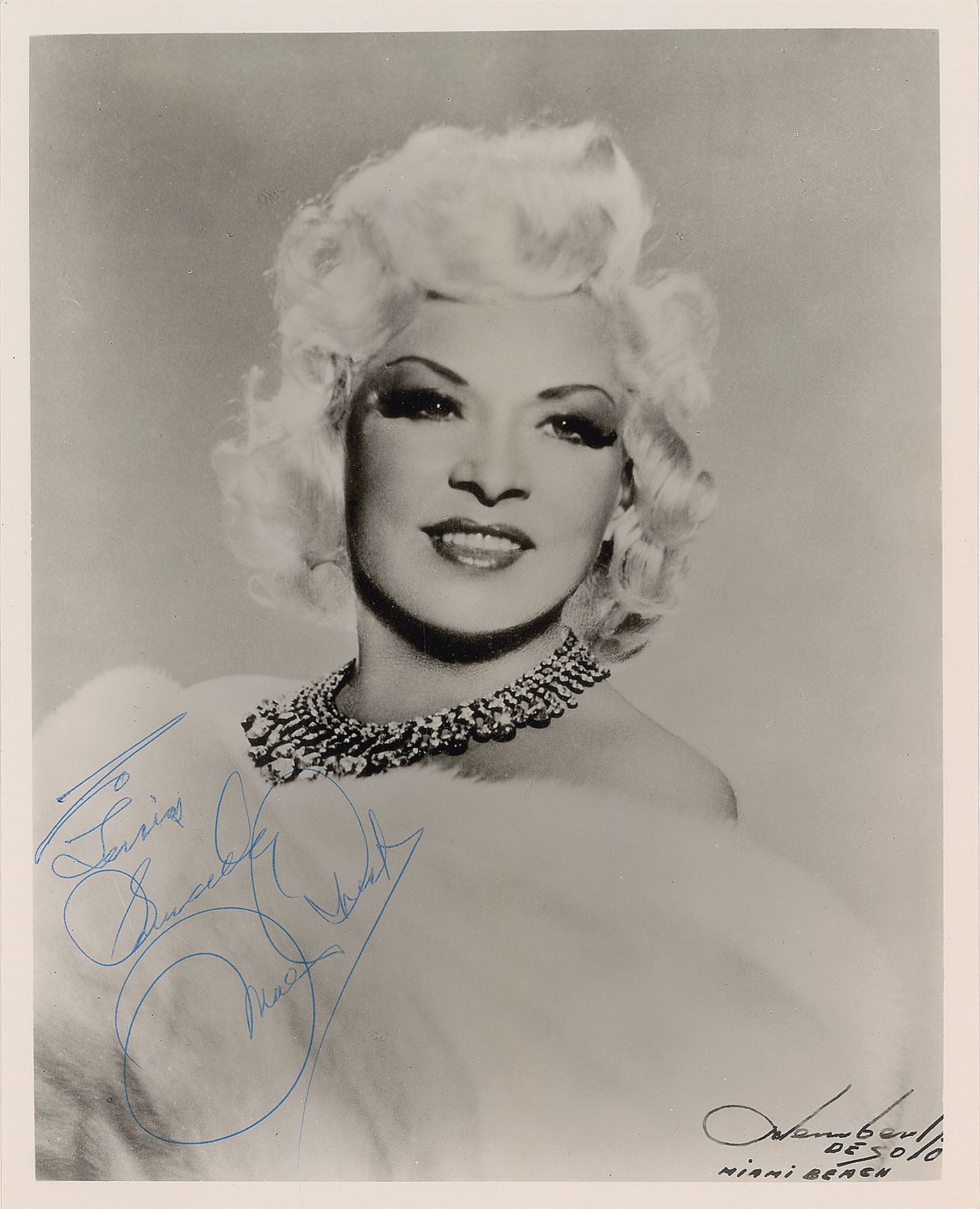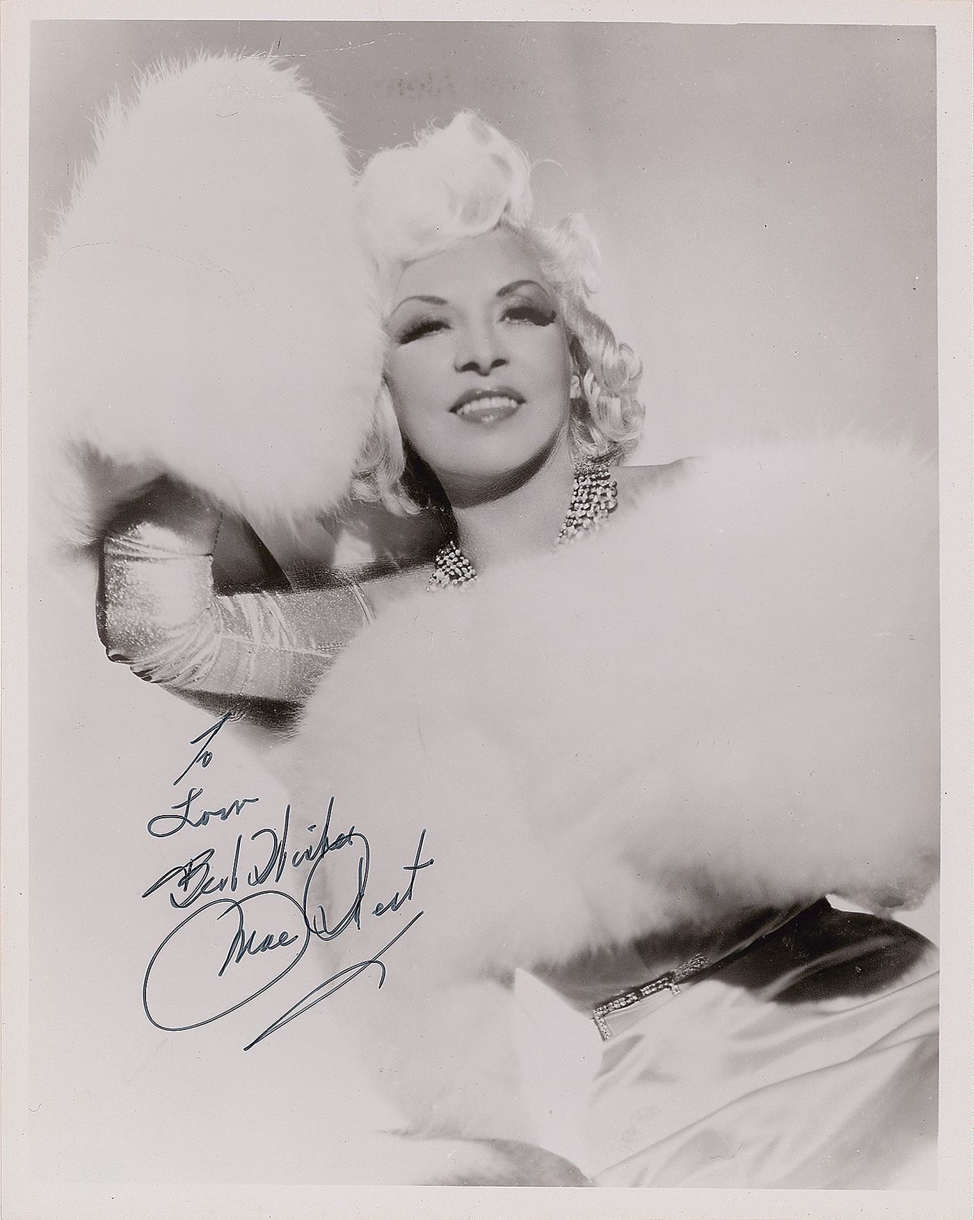 Two glossy 8 x 10 photos of West wrapped in fur, with one signed and inscribed in blue ballpoint, "To Louis, Sincerely, Mae West," and the other signed and inscribed in black felt tip, "To Lou, Best wishes, Mae West." In overall fine condition, with light silvering to the closer portrait (visible only at an angle) and light creasing to the other.