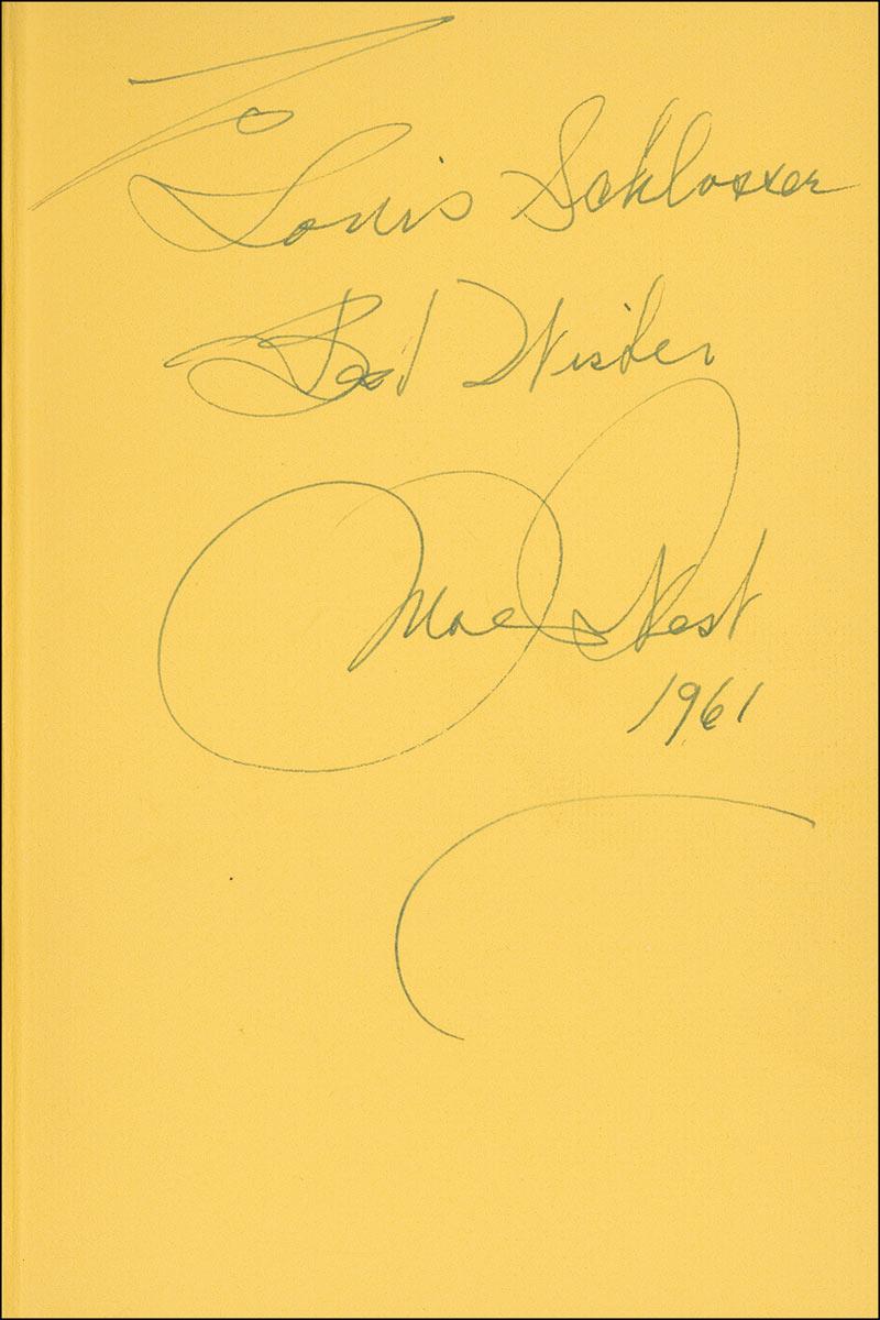 Signed book: Goodness Had Nothing to Do with It. Englewood Cliffs, New Jersey: Prentice-Hall, Inc., 1959. Hardcover, 6 x 8.75, 271 pages. Signed and inscribed in fountain pen on the yellow first free-end page, “To Louis Scholsser, Best Wishes, Mae West 1961.” In fine condition, with corner bumps to the boards and an owner’s bookplate affixed to the front board.