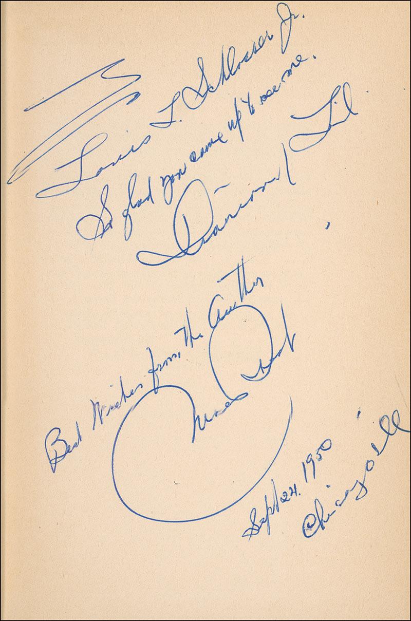 Signed book: Diamond Lil. Later printing. NY: Sheridan House, 1949. Hardcover, 5.75 x 8.25, 256 pages. Signed and inscribed in fountain pen on the first free-end page, “To Louis L. Scholsser, Jr., So glad you came up to see me, Diamond Lil. Best Wishes from the author, Mae West Sept. 24, 1950. Chicago, Ill.” In fine condition, with light soiling, corner bumps to the boards, and an owner’s bookplate affixed to the front board.