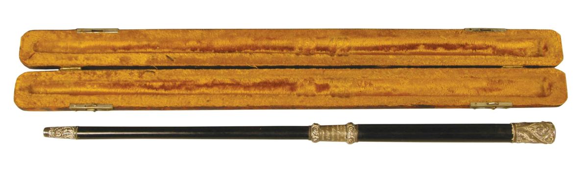 Maestro's wand with original case. Sterling silver handle, bezzel and tip. Engraved, Presented to Clinton H. Martin by the members of Palisade, Colorado Concert Band 1908. Approx. 16 inches long.