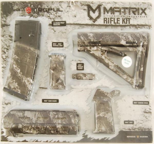 Comes with magazine, vertical grip, carbine stock, trigger guard, pistol grip, and hand guard. New in package.
