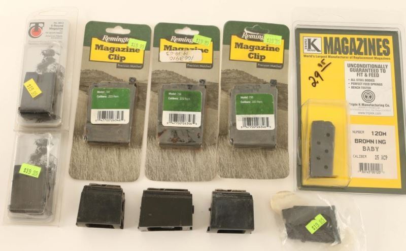 Including 2 five rd Thompson Center mags for 22LR, 1 five rd for 22LR, 3 Remington Mags for 223 Rem, 1 Triple K mag for a Browning Baby 25 ACP, and 3 Ruger factory mags.